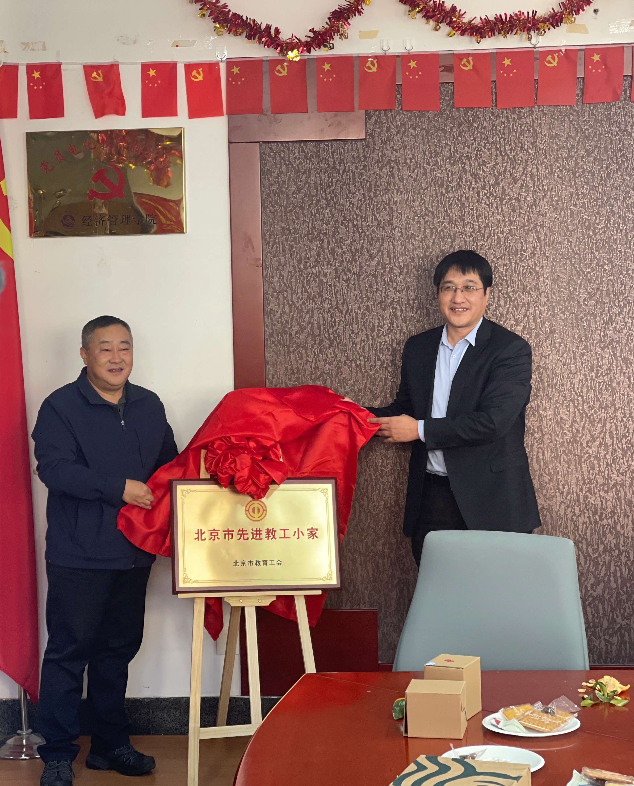 李全明副校长发表讲话,充分肯定了经管学院在过去一年取得的成绩,鼓励学院师生奋发进取,再创佳绩。在掌声中,李全明副校长和赵继新院长为学院“北京市先进教工小家”揭牌,标志着学院工会服务能力得到有效提升,将进一步推动学院人文关怀和对教师权益保护的加强。