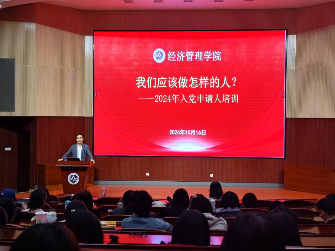 为深入学习贯彻党的二十届三中全会精神,从源头保证发展党员质量、将党员教育管理做细做实,10月16日,经管学院党委书记谢朝阳通过讲党课的形式为2024年入党申请人进行培训。学院党委副书记王帏主持会议。