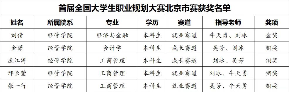 2024年3月,经管学院师生在首届全国大学生职业规划大赛北京市赛中为学校取得1金4铜的好成绩,同时还发挥学院实验中心和创新创业基地的实践教学资源作用,为学校承办市赛的分赛道工作提供了支持。