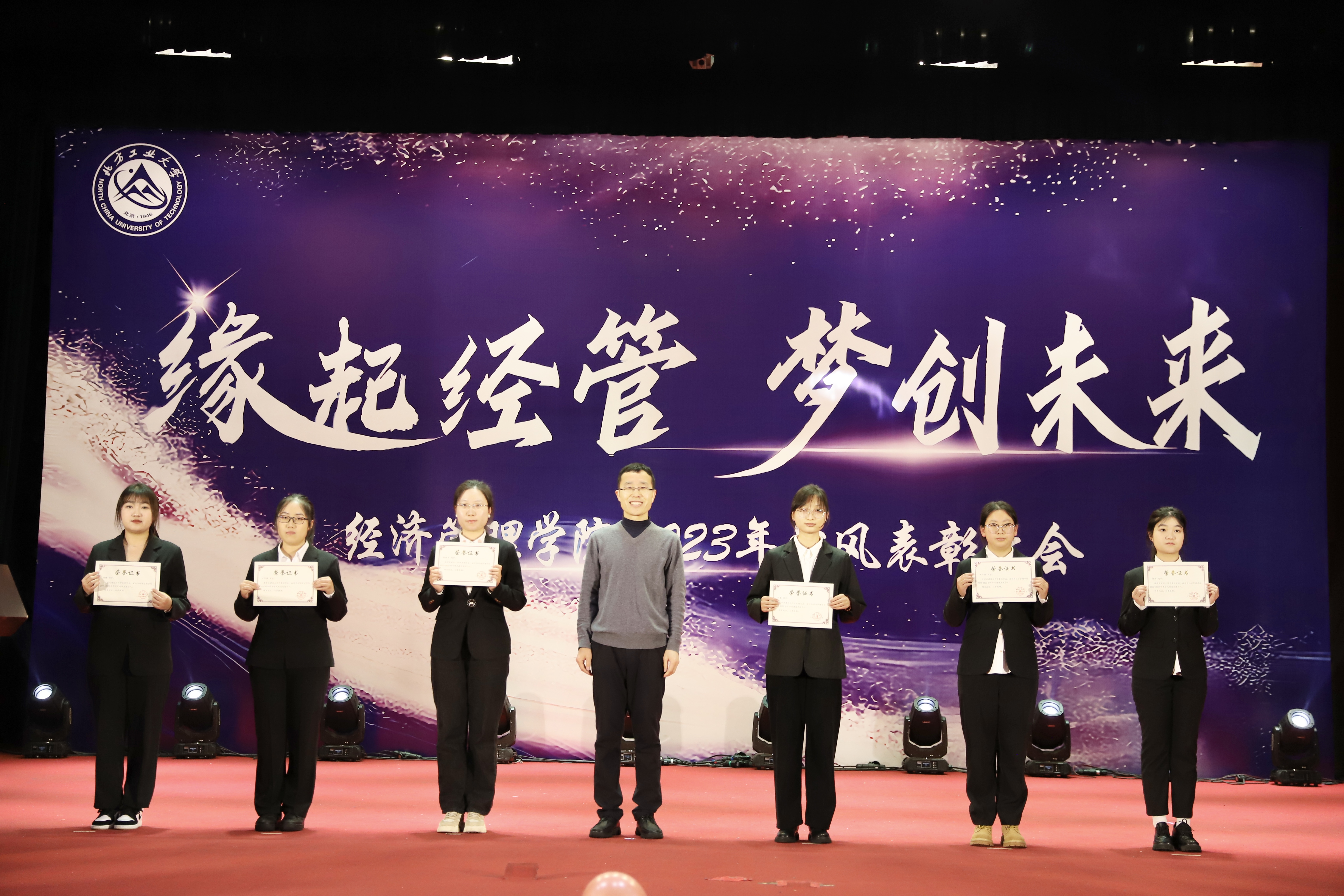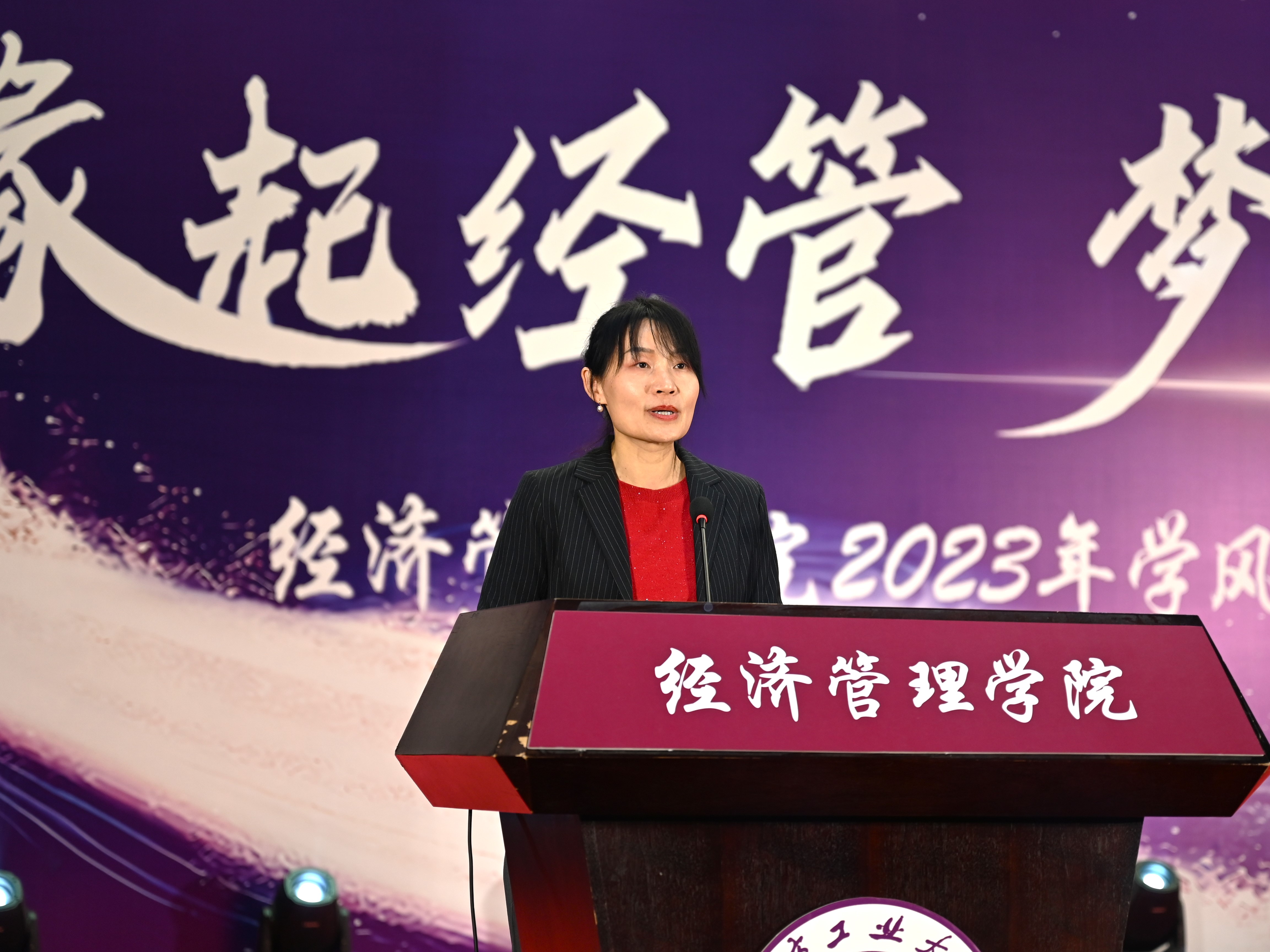 为加强学风建设,总结经验,展现学子风采,激励学院广大师生保持昂扬向上的奋斗姿态,12月14日晚,经管学院在图书信息楼报告厅举办“缘起经管 梦创未来”2023年学风表彰大会。校学生工作部部长孙宗瑞,学院领导班子全体成员,各系主任、班导师、辅导员,22级、23级全体学生参加了活动。