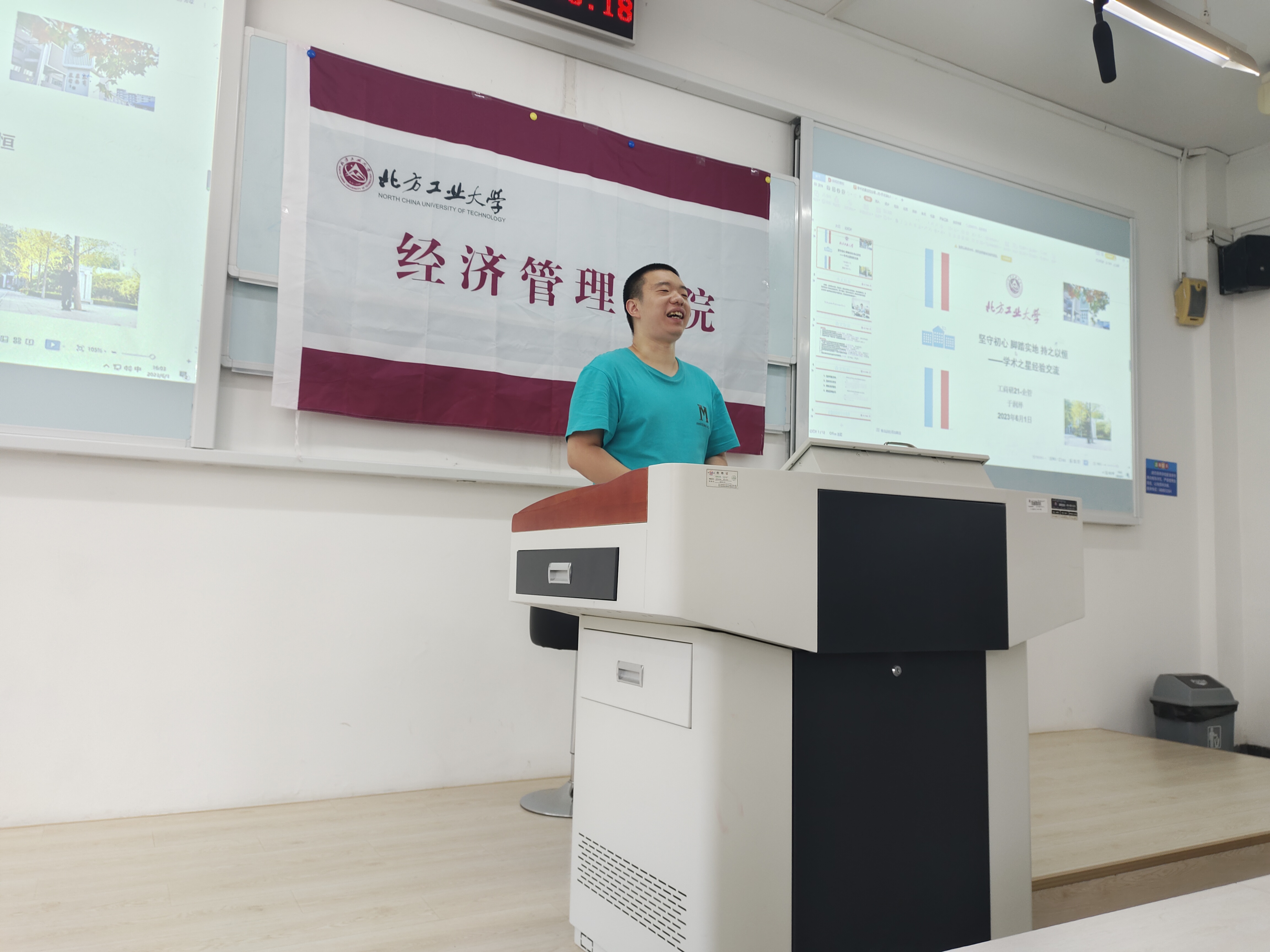 王浩东同学展示了从研一至研三发表的学术成果,并详细介绍了他在作相关研究时如何思考,怎么解决遇到的困难以及反复投稿的过程,最后激励同学们不忘初心,大胆追求自己的梦想。