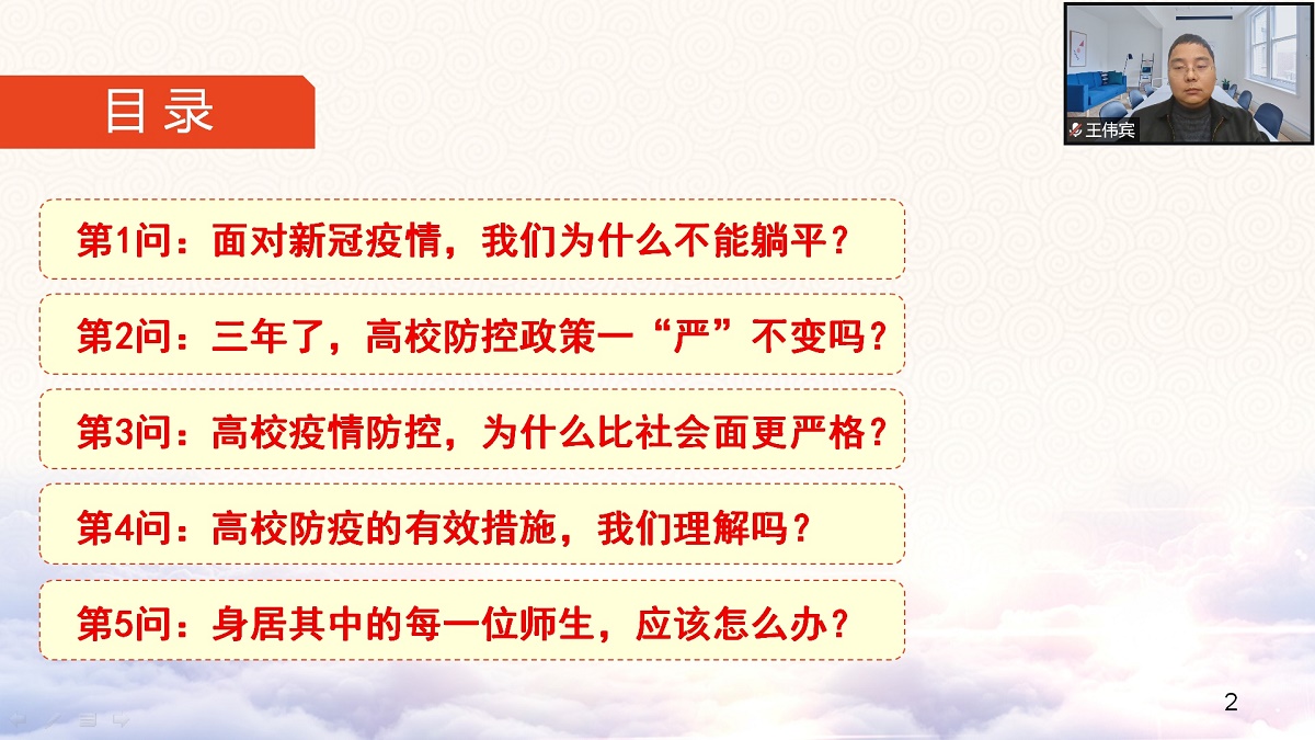 王书记围绕“面对新冠疫情,我们为什么不能躺平?”“快三年了,高校防控政策一‘严’不变吗?”“高校疫情防控,为什么比社会面更严格?”“高校防疫措施,真的有效吗?”“身居其中的每一位师生,应该怎么办?”等五个大家关于当前疫情防控的困惑和关切问题进行了分析和交流。