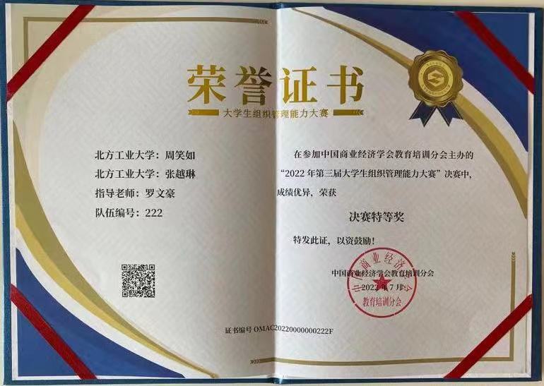 近日,由中国商业经济学会教育培训分会主办的“2022年第三届大学生组织管理能力大赛”总决赛落下帷幕,最终共有8支队伍获得决赛特等奖。我校beat365在线唯一官网学生周笑如和张越琳组成的代表队勇获特等奖,此次竞赛指导教师为管理系罗文豪副教授。