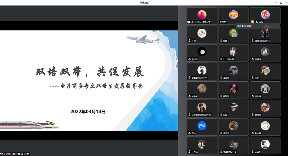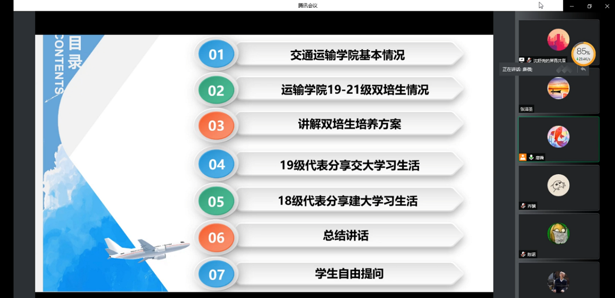 会上,唐薇主任介绍交通运输学院发展沿革、专业设置、本科生培养以及19-21级双培生在校期间的学习生活就业等情况,beat365在线唯一官网党委副书记赵洁老师在课程学习、疫情防控等方面对学生做出指导,经管学院副院长陶晓波老师解读了新修订的双培生培养方案,18级、19级双培生代表分享在交大的学习生活。会议最后的提问环节,各位参会老师对学生比较关心的学分认定、课程替换、考研等问题进行解答。最后,唐薇主任进行总结,鼓励所有同学珍惜北交大、北方工大两个平台资源,继续为自身和学校发展贡献力量。