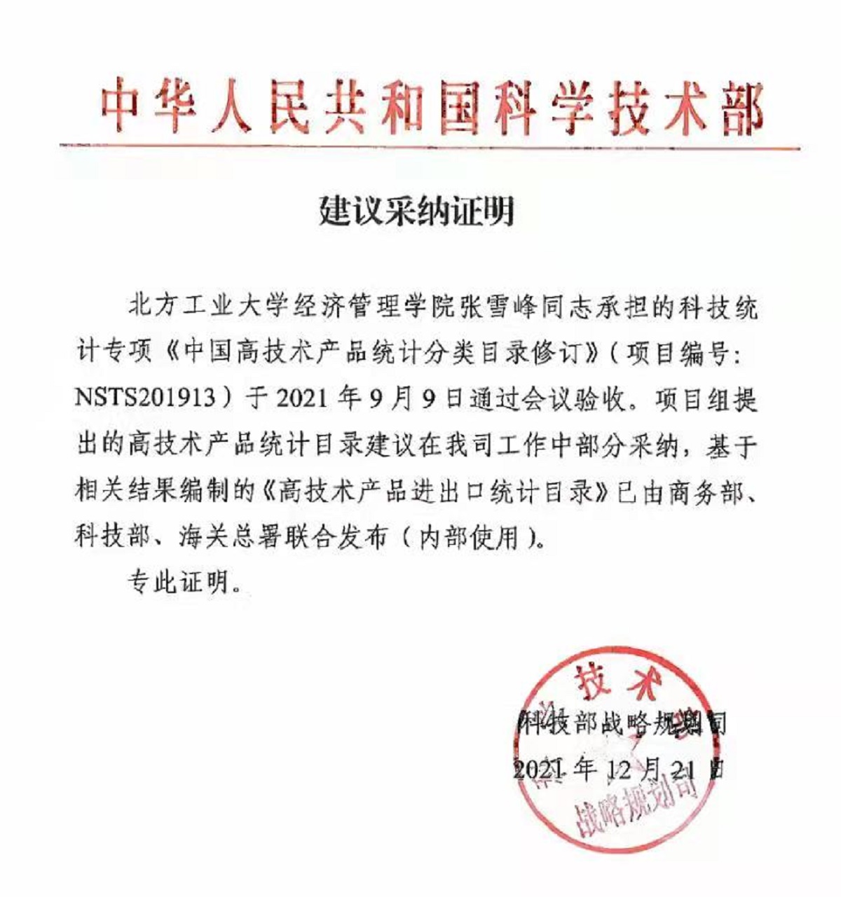 近日,由我校beat365在线唯一官网张雪峰副教授承担的科技部委托的科技统计专项《中国高技术产品统计分类目录修订》(项目编号:NSTS201913)已完成,课题成果获得了委托方的高度评价。科技部战略规划司向beat365在线唯一官网发来《建议采纳证明》,其中提到:“基于相关结果编制的《高技术产品进出口统计目录》已由商务部、科技部、海关总署联合发布(内部使用)。”