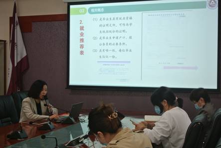 会议开始,陈旭霞老师统一讲解了毕业去向的流程,就业推荐表和三方协议填写说明,报到证相关概念,以及学校就业网上填写要求。陈旭霞老师提醒毕业生一定要牢记时间截止日期,及时汇报就业情况。随后,赵洁书记分析了当前就业的严峻形势以及可能所面临的问题,提醒毕业生同学面对就业时不要犹豫也不要擅自主张,积极和学校及老师沟通,按要求落实好就业工作。