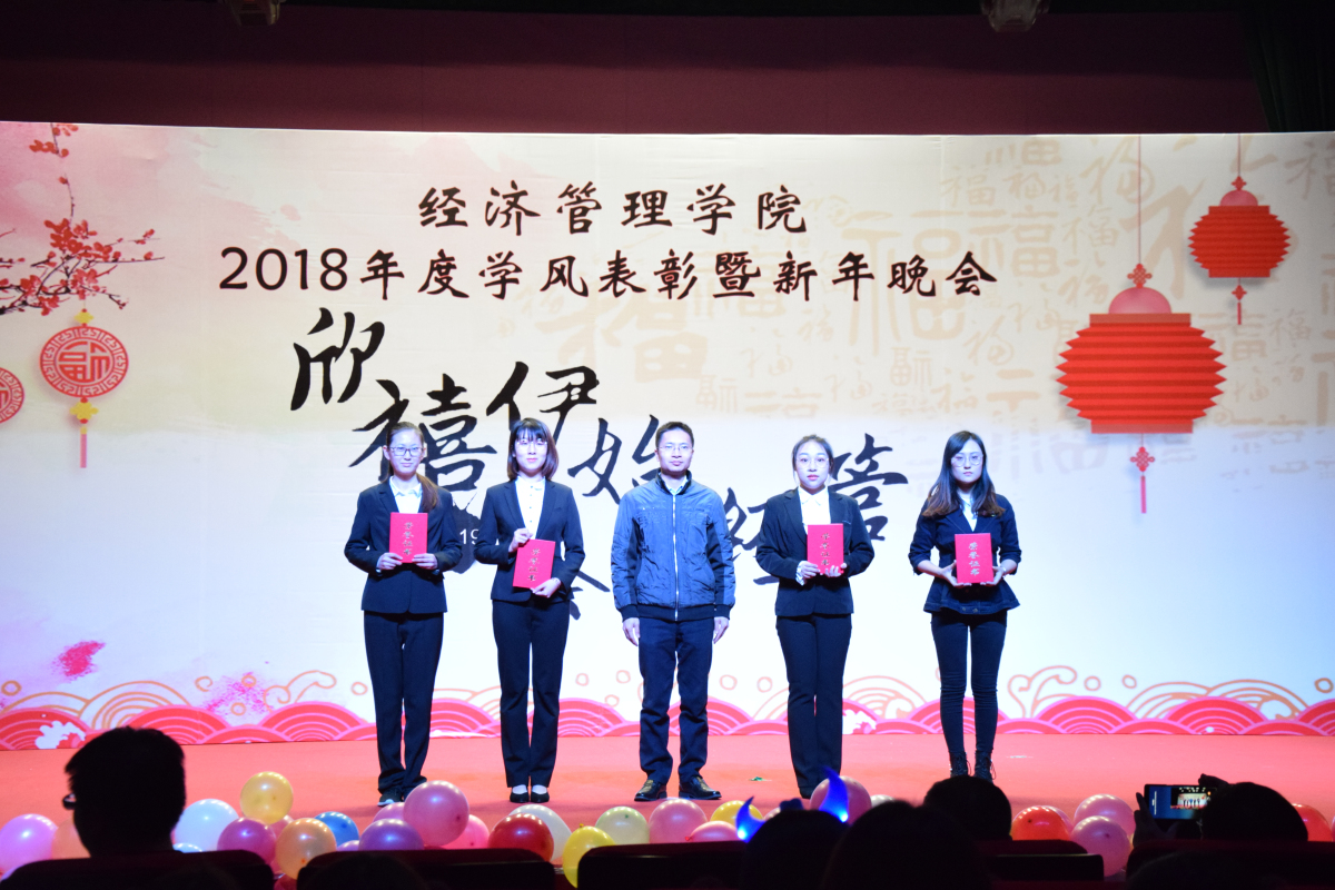 2018年12月18日晚,beat365在线唯一官网在图书馆报告厅举办“欣禧伊始 荟萃经管”2018年度学风表彰暨新年晚会。学生工作部部长高国伟、校团委书记何有华、学生工作部副部长赵帅、beat365在线唯一官网全体领导班子成员、各系主任、班导师、辅导员及600余名同学共同参加了本次晚会。
