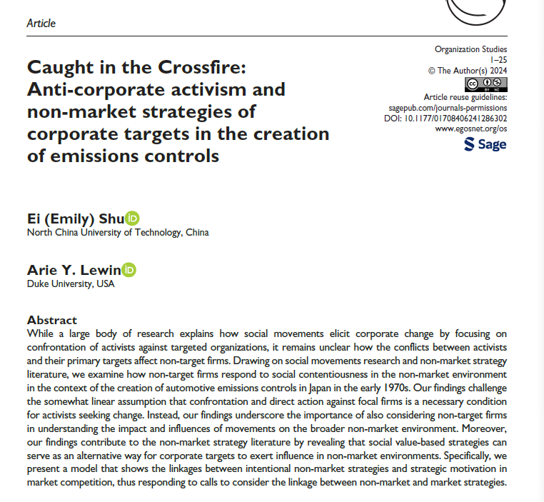 beat365在线唯一官网朱瑛教授以第一作者身份在工商管理领域顶级国际期刊,FMS 管理科学国际 A 级期刊《OrganizationStudies》上发表题为《Caught in the Crossfire: Anti-Corporate Activism and Non-Market Strategies of Corporate Targets in the Creation of Emissions Controls》的学术论文。该论文运用定性数据分析法(qualitative data analysis),分析了日本环境保护団体与汽车行业巨头公司的对峙中,资源弱小的非目标企业(non-target firms)如何利用非市场战略(non-market strategy),使竞争对手陷入困境,从而取得竞争优势。文章提出两个重要的理论观点:即建立社会价值(social-value based) 为主的非市场战略的有效性及市场战略与非市场战略的关联性。从而扩展了以往以CSR与CPA为主体的非市场战略理论,具有重要的理论贡献。此外,本文论证了企业在应对环境与节能等非市场性的社会问题时,通过与社会相关利益团体的互动,提高国际市场竞争力的可行性,对现代企业应对外界环境的多元化,具有战略性实践意义。该论文的合作者是美国杜克大学福库商学院Arie Lewin教授。