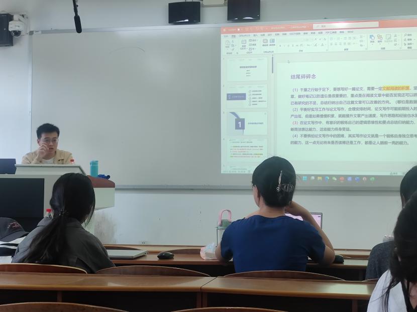 本次讲座赖凯丰同学结合自身在学术道路上摸索的经验对研究生论文写作的思路和方法作了详尽的介绍。首先他点出论文初学者的难点和误区,主要是缺乏理论认识和知识创新理解导致内容逻辑不足。其次,讲解了实证论文的基本逻辑。然后着重讲解了论文中的文献综述部分以及数据处理部分。在文献综述部分,赖凯丰同学归纳了新手写文献综述存在的问题,传授精读文献、写好文献综述的方法。在数据分析部分,传授了查找数据并进行数据分析的经验。最后,强调文献阅读的积累是写好一篇论文的前提,并指出“论文写作中锻炼出的逻辑思维能力和归纳总结能力,会使研究生终身受益”。