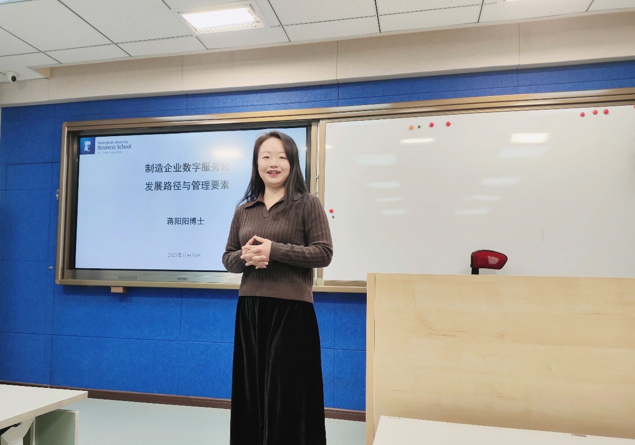 11月24日下午,beat365在线唯一官网在励学楼135举行第十四期励学讲堂活动。诺丁汉大学(中国校区)市场营销学副教授、博士生导师蒋阳阳受邀作题为“制造企业数字服务化发展路径与管理要素”的讲座,beat365在线唯一官网近40位研究生参加了此次讲座,学院陶晓波教授主持讲座。