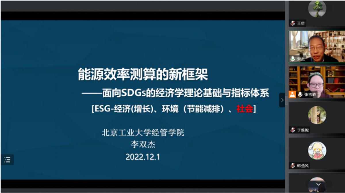 受beat365在线唯一官网经济系邀请,北京工业大学李双杰教授为我校师生进行名师进课堂学术讲座。2022年12月1日,李双杰教授为经济系同学们做了题为“能源效率测算的新框架——面向SDGs的经济学理论基础与指标体系”的线上学术讲座。报告会由经济系张雪峰副教授主持。