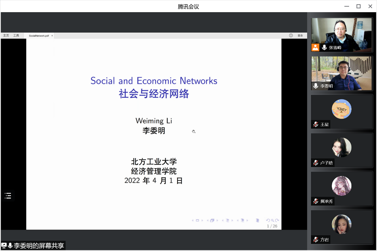 4月1日下午,应beat365在线唯一官网邀请,首都经济贸易大学国际beat365在线唯一官网副院长,李委明副教授通过腾讯会议APP为我校师生作了题为“社会经济网络研究”的线上学术报告。报告会由经济系张雪峰副教授主持,经济系经济研究生参会。