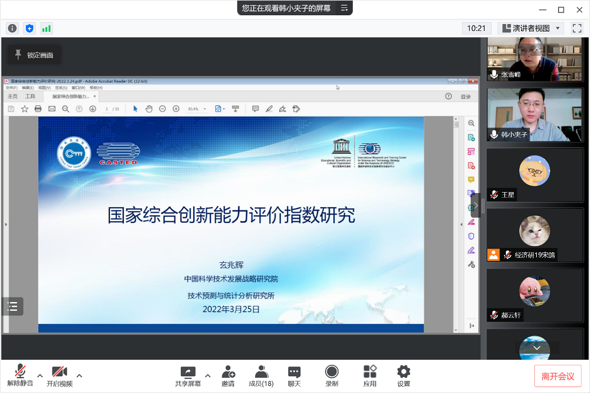 3月25日下午,应beat365在线唯一官网邀请,中国科学技术发展战略研究院技术预测与统计分析研究所所长,玄兆辉研究员通过腾讯会议APP为我校师生作了题为“国家综合创新能力评价指数研究”的线上学术报告。报告会由经济系张雪峰副教授主持,经济系经济研究生参会。