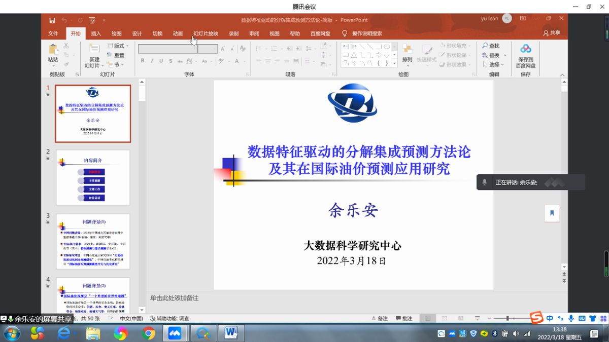 本报告主要介绍一种数据特征驱动的分解集成预测方法论并用来进行国际油价预测。报告首先从预测方法角度出发,分析创新国际油价预测方法的重要性与科学意义。其次,从预测科学学科发展角度出发,结合数据本身的特点,提出新预测方法论的基本思路。再次,根据新方法论的思路,详细介绍数据特征驱动的分解集成预测方法论的具体细节,在此基础上对国际油价预测进行实证分析。最后,报告结合研究成果,给出该方法论的同行评价,并展望未来研究方向。余乐安教授还就师生提出的问题进行了交流讨论。