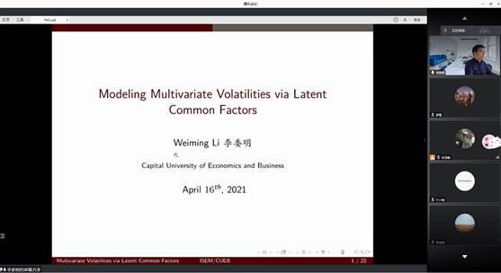 4月16日下午,应beat365在线唯一官网邀请,首都经济贸易大学国际beat365在线唯一官网院长聘副教授、博士生导师李委明通过腾讯会议APP为我校师生作了题为“高维金融数据的波动性因子分析”的线上学术报告。报告会由经济系张雪峰副教授主持,经济系经济研研究生与本科生参会。
