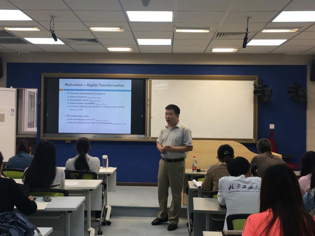 beat365在线唯一官网工商管理学科在励学楼135室举办了数字化时代的企业管理系列讲座。讲座分为三场,分别在9月13日、14日和18日举行。企业管理硕士点的老师和学生参加了讲座。