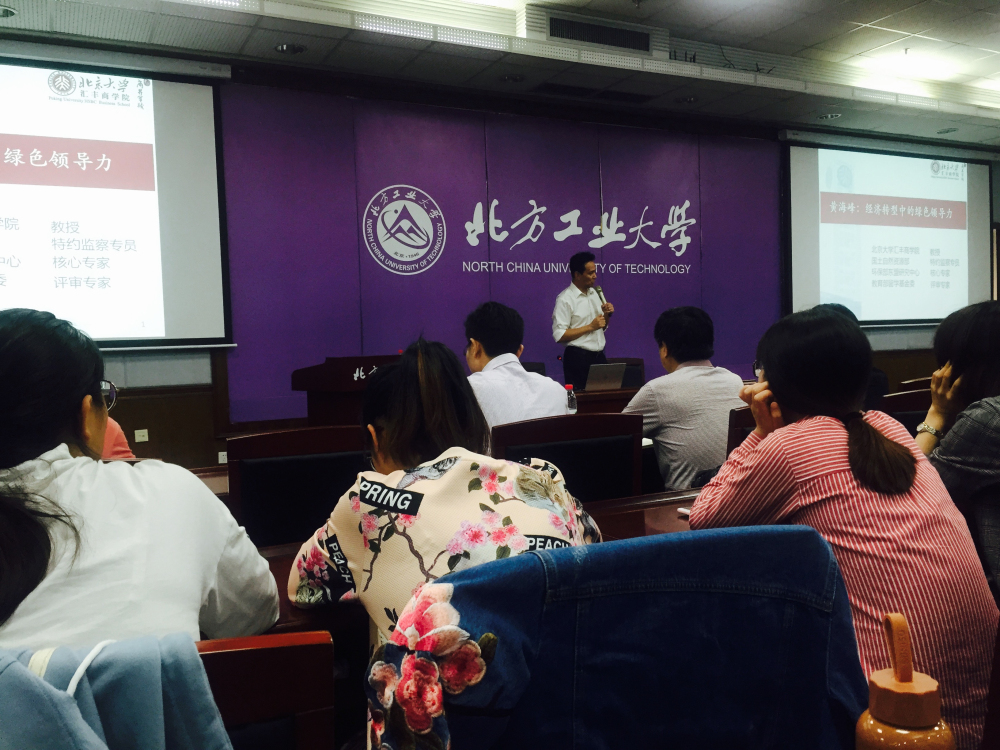 2018年9月12日18时,北京大学汇丰商学院黄海峰教授应邀在beat365在线唯一官网浩学楼15楼报告厅做题为“经济转型与绿色领导力”的报告,报告会由beat365在线唯一官网谢朝阳书记主持。