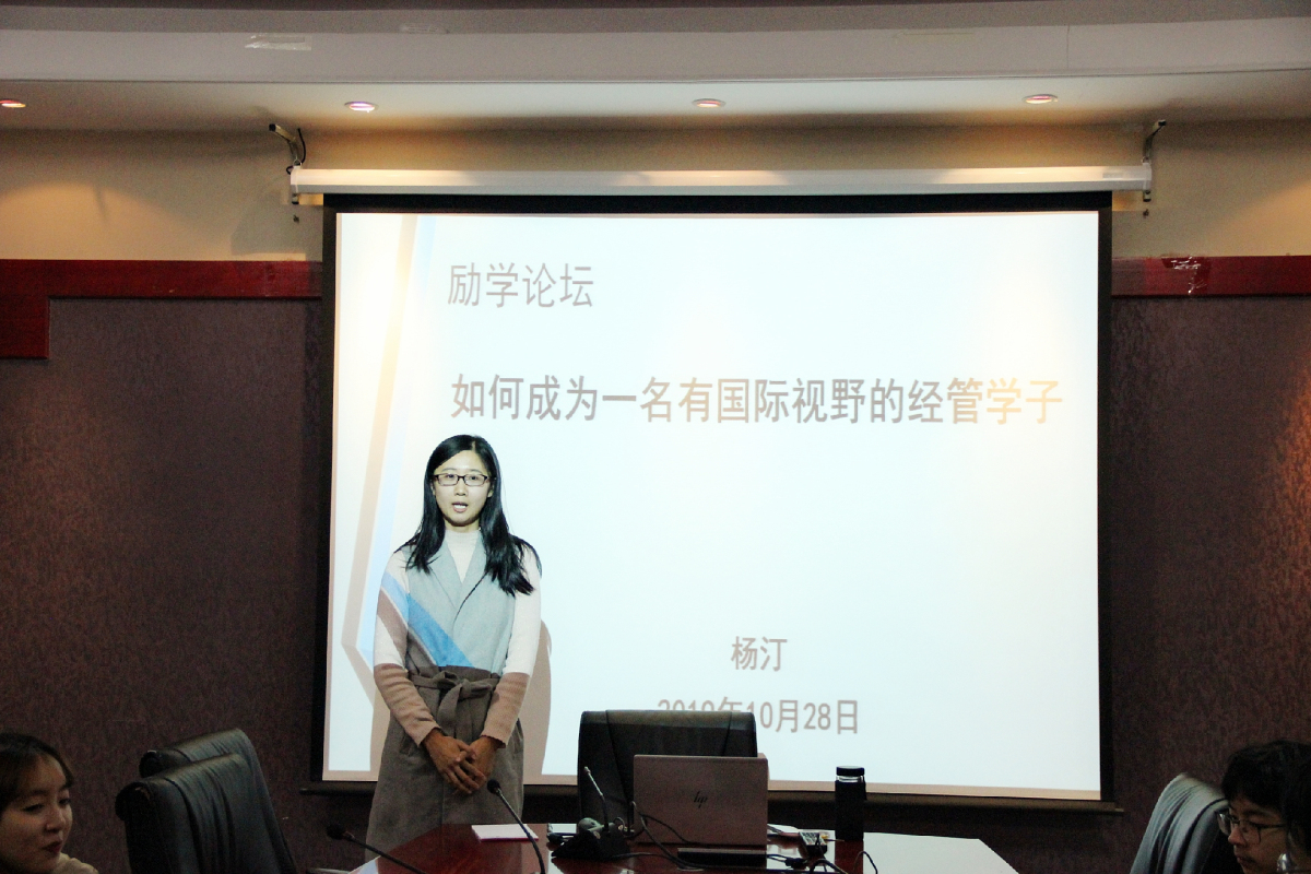 10月28日晚,beat365在线唯一官网励学论坛在励学楼201会议室举行。本期论坛主题为“如何成为一名有国际视野的经管学子”。本次论坛由教师辅导员杨汀老师主讲,青创部协办,19级国际班有出国深造意向的同学参加了此次论坛。