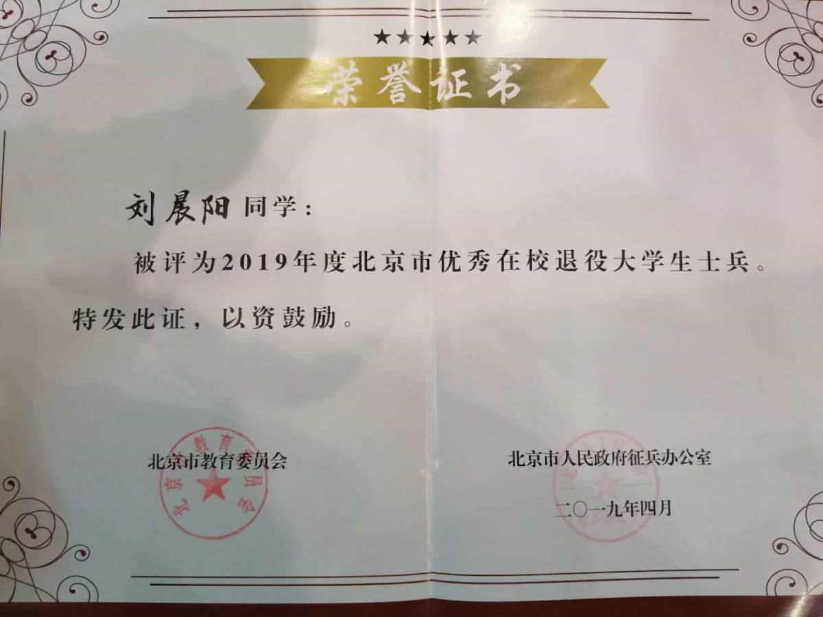 刘晨阳同学在服役期间两次获得“优秀士兵”称号,日常训练严格刻苦,比武演习名列前茅,为祖国的国防事业做出了贡献。退役复学后,更是把军队里的好作风、好习惯带到日常学习中,学习目标明确,高标准严要求。先后获得北京市“三好学生”、“beat365在线唯一官网青年五四奖章”等荣誉称号。