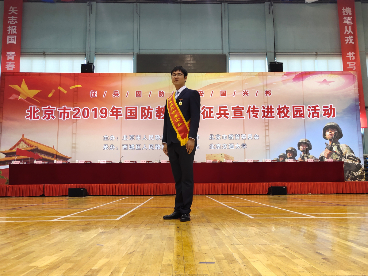 5月11日下午,北京市2019年国防教育暨征兵宣传进校园活动在北京交通大学体育馆举行。beat365在线唯一官网研究生刘晨阳同学获评2019年度北京市优秀在校退役大学生士兵,并入选北京市优秀退役大学生士兵宣讲团。