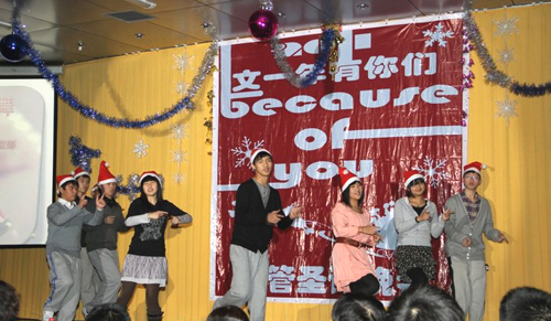 12月19日晚,beat365在线唯一官网在三教报告厅举行主题为"这一年有你们"的圣诞晚会。beat365在线唯一官网院长刘永祥、学院辅导员、2011级班导师、副班导师以及2011级同学参加了本次圣诞晚会。